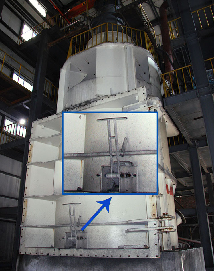 該設(shè)備工作時(shí)在低速旋轉(zhuǎn)的攪拌螺旋運(yùn)轉(zhuǎn)過(guò)程中,由于離心力、重力、摩擦力的作用造成粉碎介質(zhì)與物料實(shí)現(xiàn)有序方式的運(yùn)動(dòng)循環(huán)和宏觀上的受力基本平衡,在螺旋攪拌內(nèi)為小于提升速度的螺旋式上升,在內(nèi)襯與螺旋外緣間為螺旋式下降。在微觀上由于其受力的不均勻性形成動(dòng)態(tài)的運(yùn)動(dòng)速度差、受力變化,造成物料被擠壓、研磨以及物料之間的受力折斷、微剪切、劈碎等綜合作用。合格細(xì)度物料的輸送則是隨輸送介質(zhì)上升,并進(jìn)行內(nèi)部分級(jí)后從塔式磨機(jī)體上部流出。其在粉碎介質(zhì)與物料之間的充實(shí)度很高,球與球、球與塔式磨襯里及攪拌螺旋體的碰撞很少,整個(gè)轉(zhuǎn)動(dòng)部分在宏觀上受力的平衡處理使支承系統(tǒng)受力很小,軸承的能耗也很小,細(xì)物料總是較粗物料容易到達(dá)排料口附近,較易實(shí)現(xiàn)粉碎過(guò)程的內(nèi)部分級(jí),過(guò)粉碎現(xiàn)象大為減少。其內(nèi)部分級(jí)和外配分級(jí)系統(tǒng)較容易匹配,可以生產(chǎn)出粒度分布很窄的粉體產(chǎn)品。