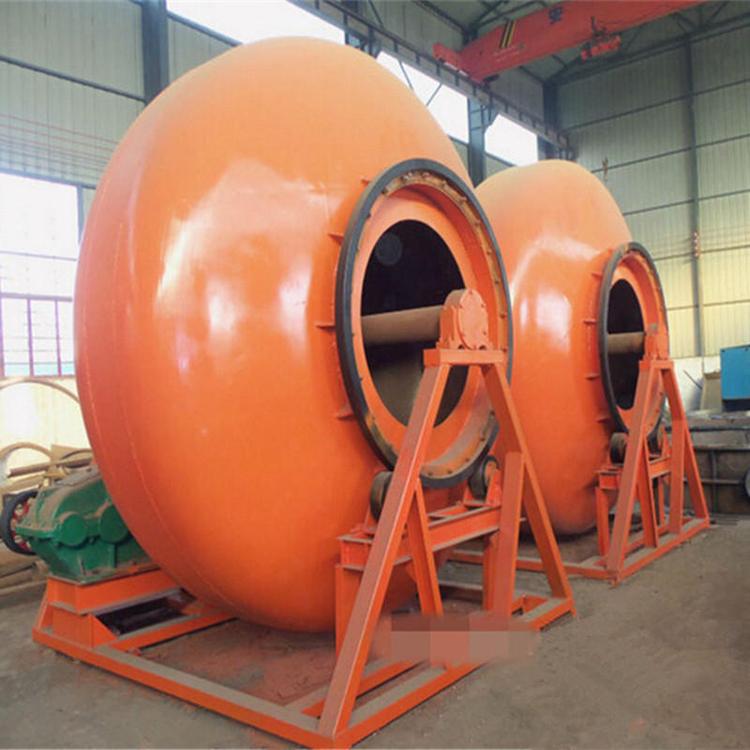 它的傳動(dòng)裝置通過(guò)過(guò)橋裝置帶動(dòng)筒體旋轉(zhuǎn),且筒體軸線與水平面呈特定夾角;當(dāng)粉料通過(guò)進(jìn)料口加入筒體內(nèi)后,開(kāi)始向筒體內(nèi)部噴水,濕潤(rùn)的粉料在翻滾的同時(shí),逐漸形成球核,表面濕潤(rùn)的球核在不斷翻滾、摩擦、碰撞下,逐漸長(zhǎng)大成粒,當(dāng)粒徑達(dá)到要求時(shí),通過(guò)卸料門將其卸下。